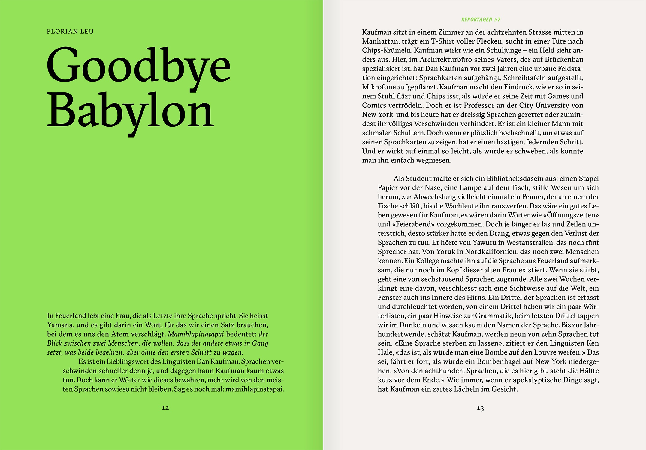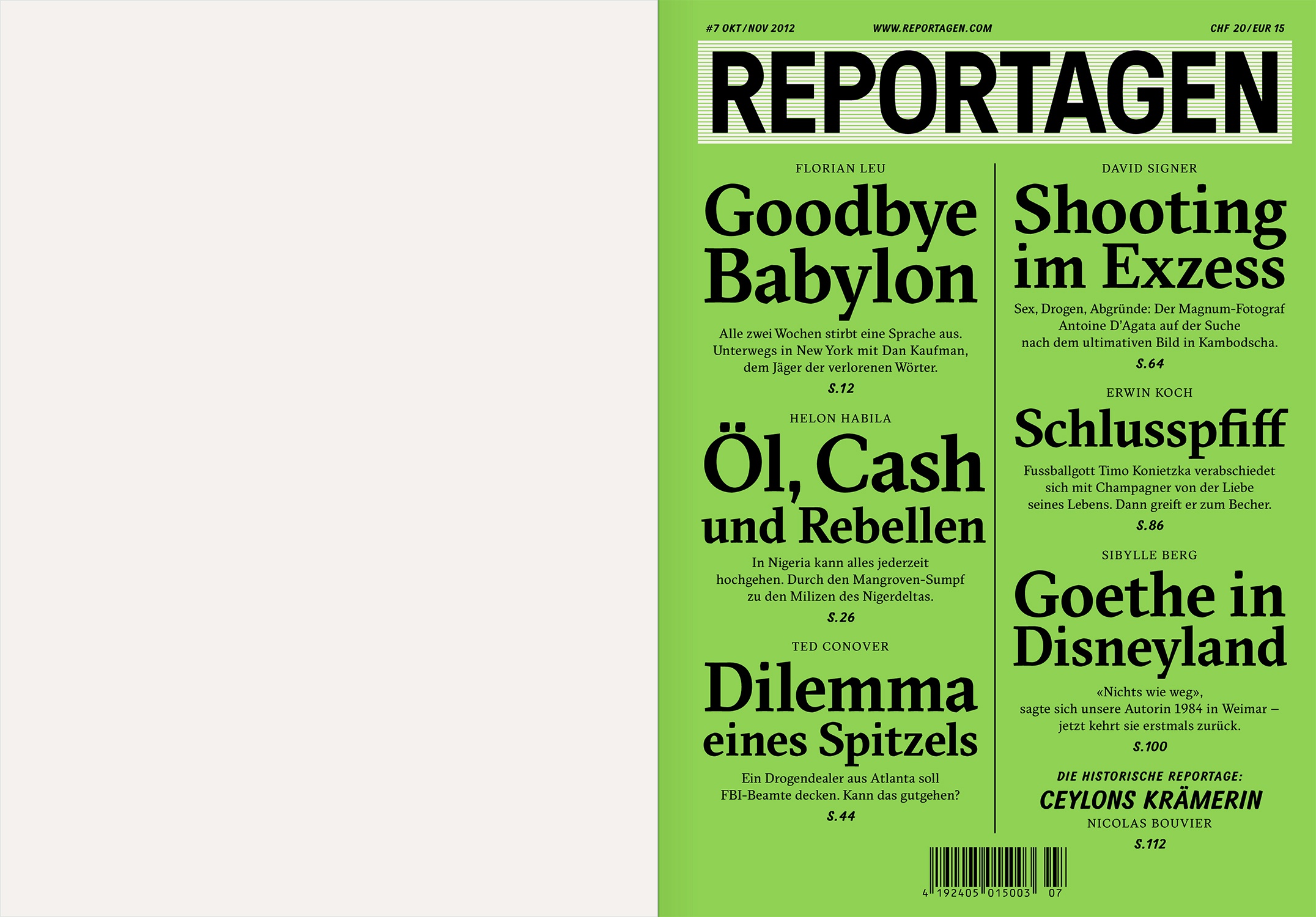 Reportagen #7: u.a. mit einer amüsanten Geschichte über das Bewahren von aussterbenden Sprachen und einem Portrait über den Fotografen Antoine D'Agata der für seine Bilder buchstäblich alles gibt. www.reportagen.com.